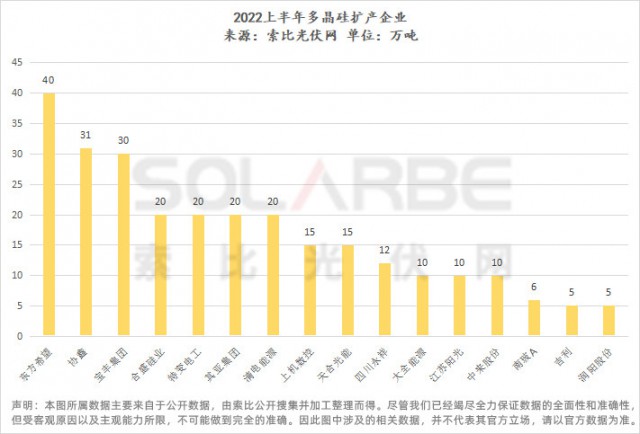 ●為填補供應缺口,2022年上半年,有不少于19家企業(yè)發(fā)布硅料擴產(chǎn)計劃,擴產(chǎn)總量達458萬噸(多晶硅269萬噸,工業(yè)硅189萬噸),投資金額超1620億,擴產(chǎn)多集中在新疆、內蒙古、寧夏、四川等地。