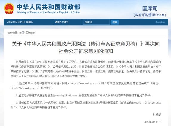 ?圖:財政部國庫司發(fā)布關于《中華人民共和國政府采購法(修訂草案征求意見稿)》
