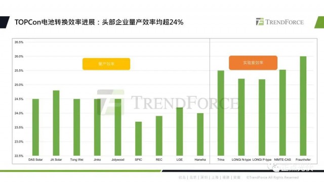 當(dāng)前,TOPCon頭部企業(yè)的量產(chǎn)效率都突破了24%,比PERC平均要高0.5%-0.8%,2023年的量產(chǎn)效率也有望朝著24.5%-25%邁進。TOPCon的實驗室轉(zhuǎn)換效率目前都超過了25%,今年的四月份晶科公布了182版型的n型TOPCon電池片的轉(zhuǎn)換效率,已經(jīng)達(dá)到了25.7%,打破新的記錄。