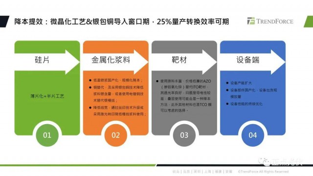 目前HJT技術(shù)降本增效的路徑還是比較確定的,硅片端主要是薄片化以及半片工藝的發(fā)展,金屬化漿料方面,包括低溫銀漿的國產(chǎn)化、規(guī)?;当?銀包銅、電鍍銅上降低銀漿的耗量,靶材價格以及用量的下降,還有設(shè)備國產(chǎn)化、規(guī)?;当镜确矫?。