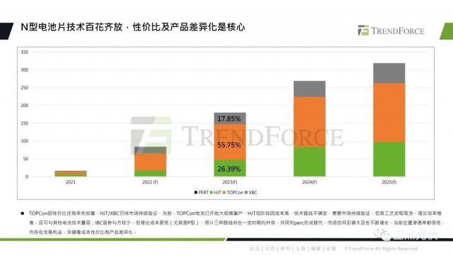 TOPCon因為它的性價比優(yōu)勢,實現(xiàn)了率先放量。預(yù)計到2023年底,N型電池片的產(chǎn)能將達(dá)到180GW,占比約為25.7%。