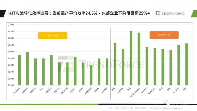 再來具體看一下HJT技術(shù)產(chǎn)能進展及效率方面。目前HJT技術(shù)發(fā)展進入瓶頸期,全球企業(yè)宣告的已建成產(chǎn)能為11.6GW。雖然規(guī)劃的產(chǎn)能比較多,但是待建的產(chǎn)能還是比較少的。核心原因還是因為當(dāng)前HJT的生產(chǎn)成本相對較高,與PERC量產(chǎn)效率并未顯出更高水平,產(chǎn)品溢價有限。