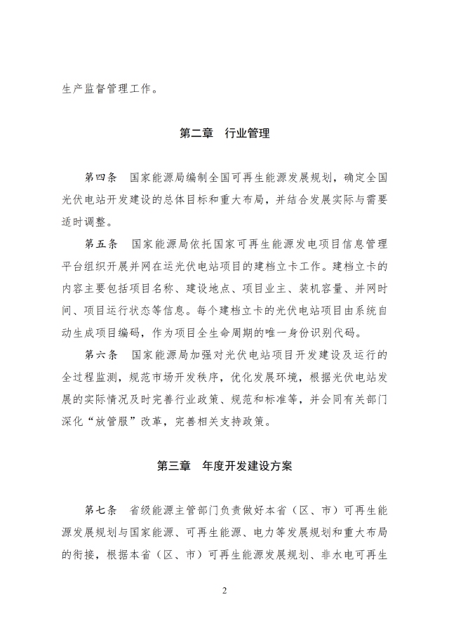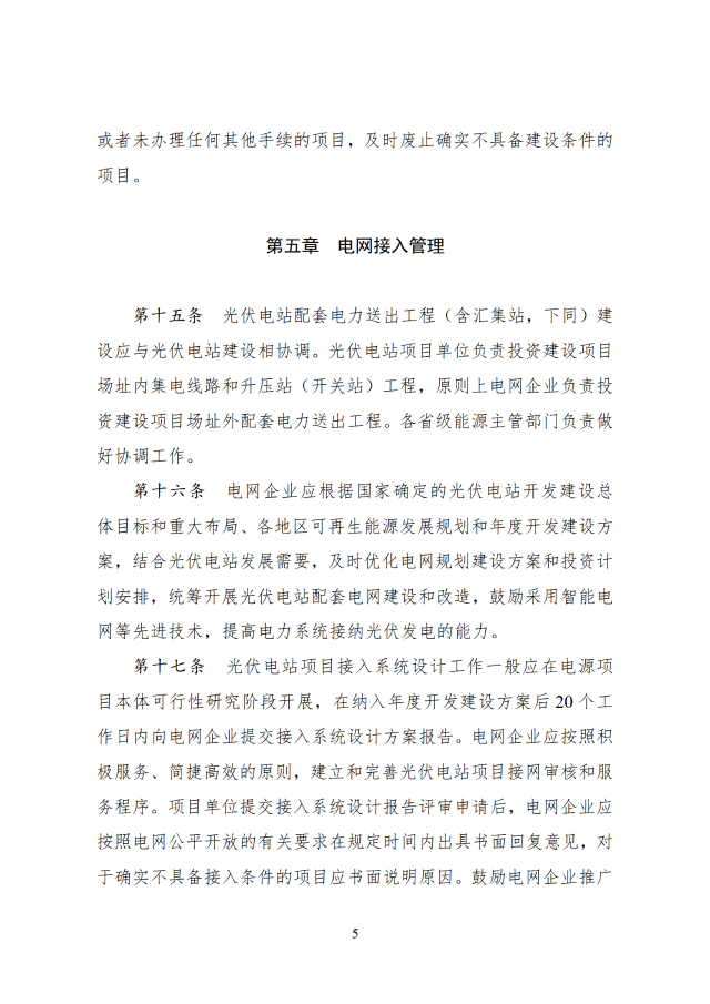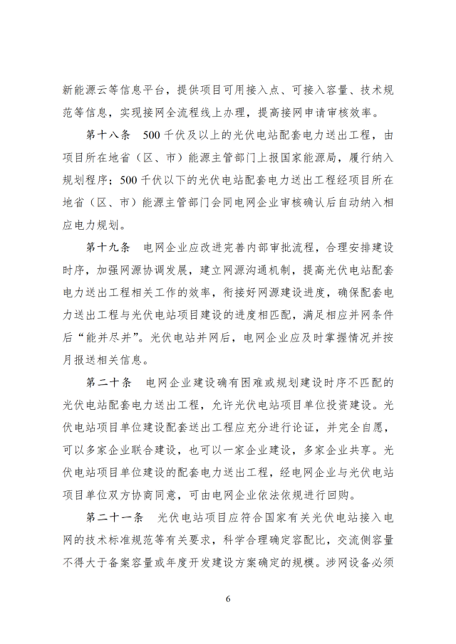 省級能源主管部門負(fù)責(zé)做好本省(區(qū)、市)可再生能源發(fā)展規(guī)劃與國家能源、可再生能源、電力等發(fā)展規(guī)劃和重大布局的銜接,根據(jù)本省(區(qū)、市)可再生能源發(fā)展規(guī)劃、非水電可再生能源電力消納責(zé)任權(quán)重以及電網(wǎng)接入與消納條件等,制定光伏電站年度開發(fā)建設(shè)方案。涉及跨省跨區(qū)外送消納的光伏電站,相關(guān)送受端省(區(qū)、市)能源主管部門在制定可再生能源發(fā)展規(guī)劃、年度開發(fā)建設(shè)方案時(shí)應(yīng)充分做好銜接。