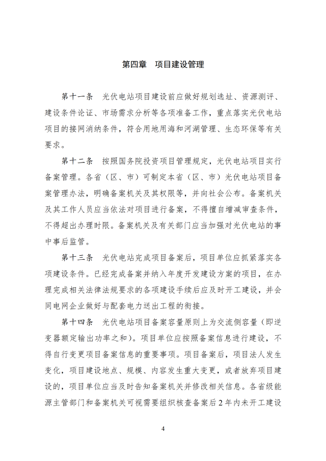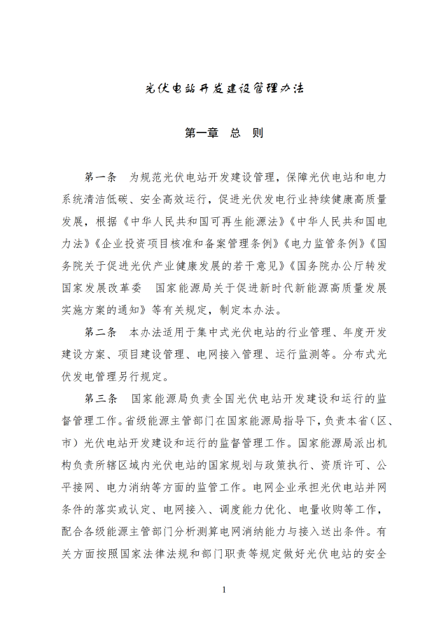 12月26日,國家能源局印發(fā)關(guān)于《光伏電站開發(fā)建設(shè)管理辦法》的通知,通知提到,國家能源局負(fù)責(zé)全國光伏電站開發(fā)建設(shè)和運(yùn)行的監(jiān)督管理工作,電網(wǎng)企業(yè)承擔(dān)光伏電站并網(wǎng)條件的落實(shí)或認(rèn)定、電網(wǎng)接入、調(diào)度能力優(yōu)化、電量收購等工作,配合各級能源主管部門分析測算電網(wǎng)消納能力與接入送出條件。有關(guān)方面按照國家法律法規(guī)和部門職責(zé)等規(guī)定做好光伏電站的安全生產(chǎn)監(jiān)督管理工作。
