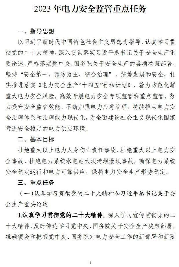 為貫徹落實(shí)黨的二十大精神,扎實(shí)做好2023年電力安全監(jiān)管工作,確保電力系統(tǒng)安全穩(wěn)定運(yùn)行和電力可靠供應(yīng),推動(dòng)全國(guó)電力安全生產(chǎn)形勢(shì)持續(xù)穩(wěn)定向好,我局制定了《2023年電力安全監(jiān)管重點(diǎn)任務(wù)》?,F(xiàn)印發(fā)給你們,請(qǐng)結(jié)合本地區(qū)、本單位實(shí)際,認(rèn)真貫徹落實(shí)。