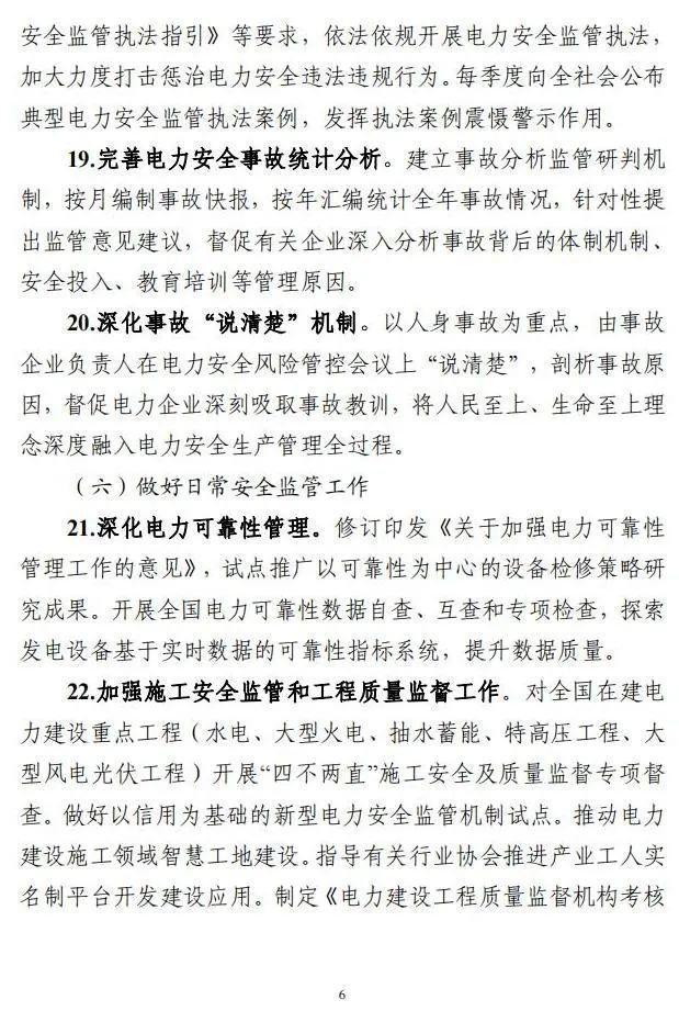 加強(qiáng)施工安全監(jiān)管和工程質(zhì)量監(jiān)督工作。對(duì)全國(guó)在建電力建設(shè)重點(diǎn)工程(水電、大型火電、抽水蓄能、特高壓工程、大型風(fēng)電光伏工程)開展“四不兩直”施工安全及質(zhì)量監(jiān)督專項(xiàng)督查。做好以信用為基礎(chǔ)的新型電力安全監(jiān)管機(jī)制試點(diǎn)。