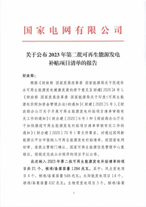 關(guān)于公布2023年第二批可再生能源發(fā)電補貼項目清單的報告