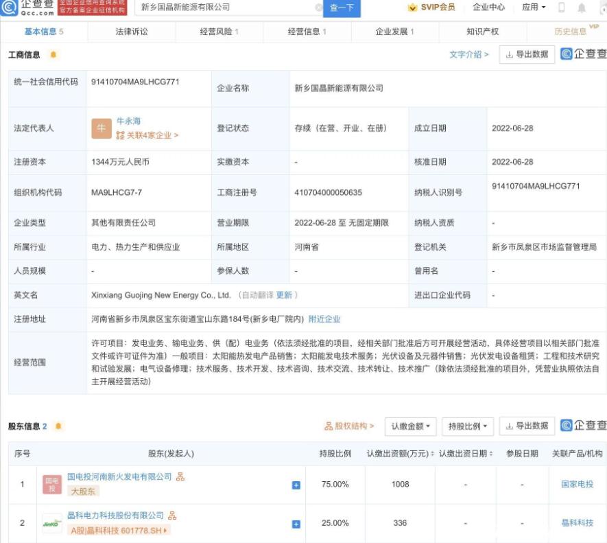 企查查股權(quán)穿透顯示,該公司由國(guó)電投河南新火發(fā)電有限公司、晶科科技共同持股。