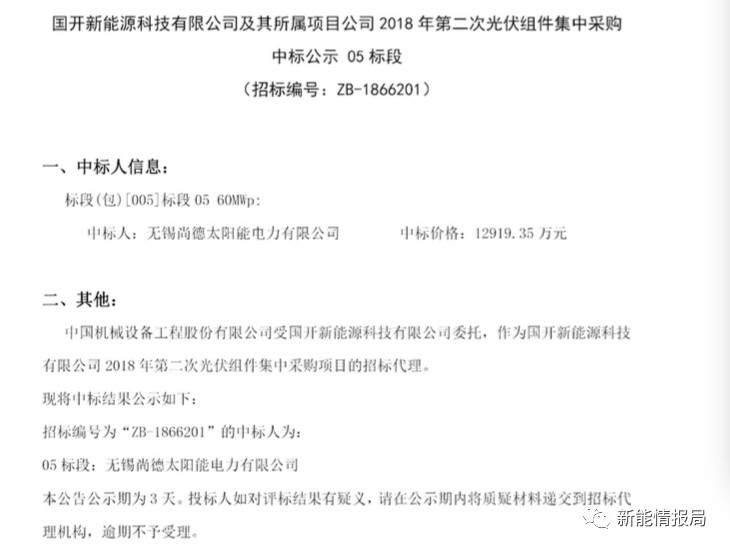 其中,無(wú)錫尚德太陽(yáng)能電力有限公司中標(biāo)04、05兩個(gè)標(biāo)段,中標(biāo)價(jià)2.584億元。英利能源中標(biāo)01、02標(biāo)段,中標(biāo)價(jià)2.505億元,晉能清潔能源中標(biāo)03標(biāo)段,中標(biāo)價(jià)1.314億元。