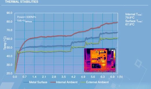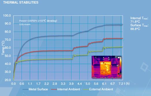 代表機型2:S廠商逆變器。逆變器內(nèi)部溫度比機箱外殼溫度高15度左右,在環(huán)境溫度45度條件下,內(nèi)部溫度約70度;