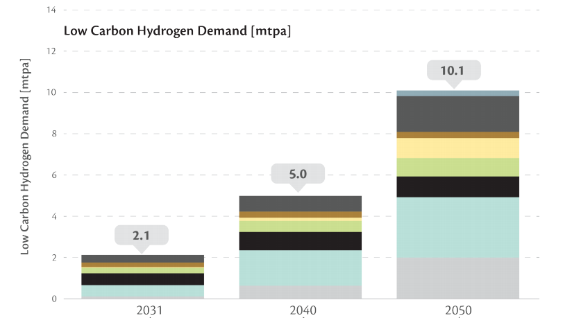 此外,該戰(zhàn)略還指出,阿聯(lián)酋生產(chǎn)出來(lái)的氫氣將主要作用于國(guó)內(nèi)工業(yè)的脫碳發(fā)展。到2031年,阿聯(lián)酋的氫能需求量將可達(dá)270萬(wàn)噸/年,其中包括出口的60萬(wàn)噸/年。