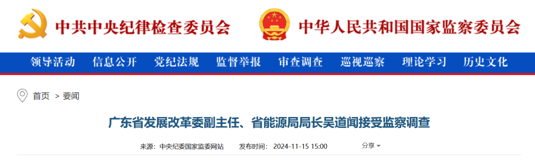 中央紀(jì)委國(guó)家監(jiān)委網(wǎng)站11月15日消息, 據(jù)廣東省紀(jì)委監(jiān)委消息:廣東省發(fā)展改革委副主任、省能源局局長(zhǎng)吳道聞涉嫌嚴(yán)重違法,目前正接受廣東省監(jiān)委監(jiān)察調(diào)查。