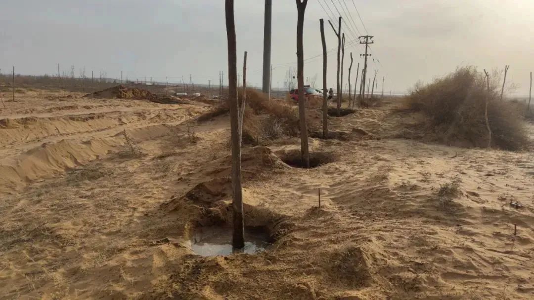 (靈武市自然資源局專業(yè)技術(shù)人員指導(dǎo)苗木保護(hù),馬家灘鎮(zhèn)工作人員對(duì)苗木進(jìn)行澆灌)
