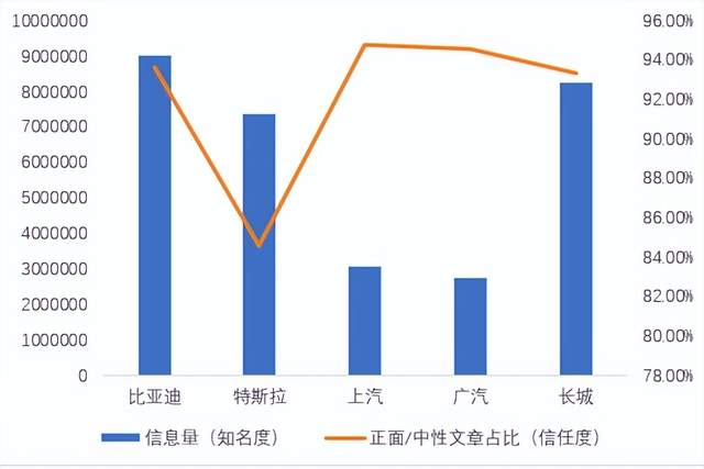 根據(jù)人民數(shù)據(jù)資產(chǎn)服務(wù)平臺(tái)數(shù)據(jù)顯示,截至2023年9月底,比亞迪、特斯拉、上汽、廣汽、長城的總信息量(知名度)和正面/中性文章占比(信任度)呈現(xiàn)出一定的特點(diǎn)。