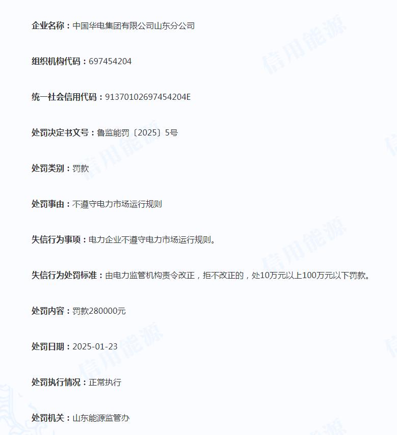 日前,信用能源公布了對中國華電集團(tuán)有限公司山東分公司的行政處罰決定,魯監(jiān)能罰〔2025〕5號處罰決定書文號顯示,中國華電集團(tuán)有限公司山東分公司不遵守電力市場運(yùn)行規(guī)則,山東能源監(jiān)管辦對其作出罰款280000元處罰。