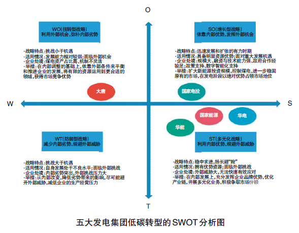 基于上述分析,結(jié)合五大發(fā)電集團(tuán)的發(fā)展特點(diǎn)總結(jié)出如圖所示的SWOT分析矩陣與轉(zhuǎn)型對(duì)策。