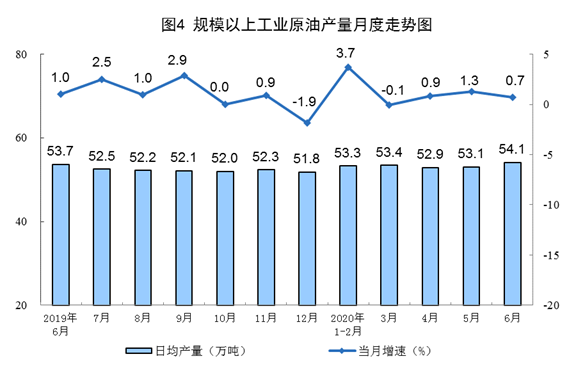 原油生產(chǎn)略有增長,加工量有所加快。6月份,生產(chǎn)原油1624萬噸,同比增長0.7%,增速比上月回落0.6個百分點;加工原油5787萬噸,增長9.0%,比上月加快0.8個百分點。上半年,生產(chǎn)原油9715萬噸,同比增長1.7%,比一季度放緩0.7個百分點;加工原油3.2億噸,同比增長0.6%,一季度為下降4.6%。