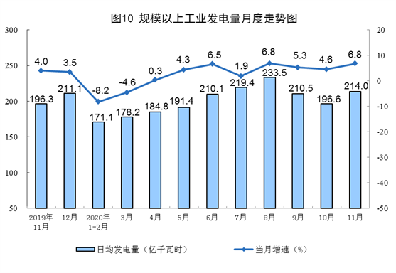 電力生產(chǎn)明顯加快。11月份,發(fā)電量6419億千瓦時(shí),同比增長6.8%,增速比上月加快2.2個(gè)百分點(diǎn);日均發(fā)電214.0億千瓦時(shí),環(huán)比增加17.4億千瓦時(shí)。1—11月份,發(fā)電量66824億千瓦時(shí),同比增長2.0%。