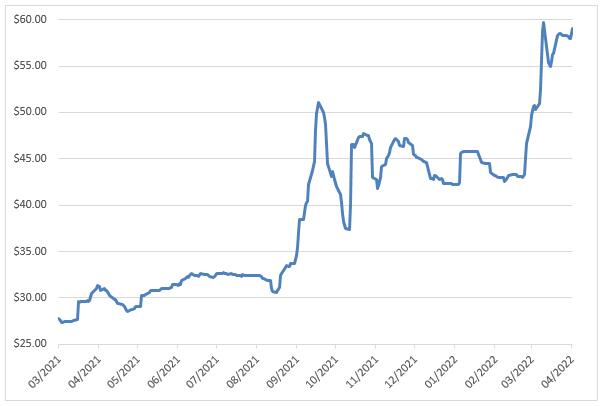 天然鈾現(xiàn)貨價(jià)格(2021.3-2022.3)