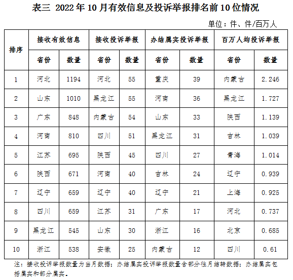 各省(自治區(qū)、直轄市)按照接收的有效信息數(shù)量排序,河北、山東、廣東、河南、江蘇、陜西、遼寧、四川、黑龍江、浙江排在全國前10位;按照接收的投訴舉報數(shù)量排序,河北、黑龍江、內(nèi)蒙古、四川、陜西、河南、遼寧、江蘇、山東、安徽排在全國前10位;按照辦結(jié)屬實(shí)的投訴舉報數(shù)量排序,重慶、河南、山東、黑龍江、四川、吉林、遼寧、廣東、浙江、內(nèi)蒙古排在全國前10位;按照百萬人均投訴舉報數(shù)量排序,內(nèi)蒙古、黑龍江、陜西、吉林、青海、遼寧、上海、河北、北京、四川排在全國前10位。(2022年10月有效信息及投訴舉報排名前10位情況見表三)