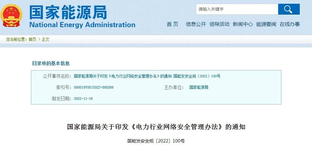 12月12日,國家能源局發(fā)布《電力行業(yè)網(wǎng)絡安全管理辦法》。