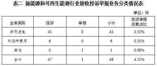 新能源和可再生能源行業(yè)排在第二位,數(shù)量為48件、占投訴舉報總數(shù)的4.11%,主要集中在并網(wǎng)發(fā)電、補貼和費用等方面。