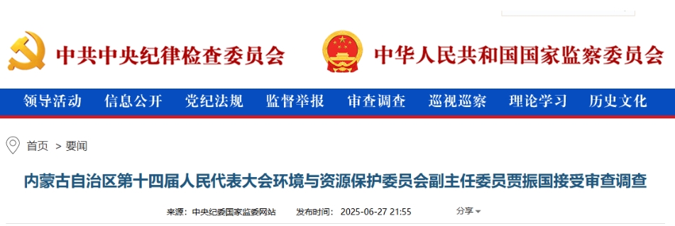 中央紀委國家監(jiān)委網(wǎng)站6月27日消息,據(jù)內蒙古自治區(qū)紀委監(jiān)委消息:內蒙古自治區(qū)第十四屆人民代表大會環(huán)境與資源保護委員會副主任委員賈振國涉嫌嚴重違紀違法,目前正接受內蒙古自治區(qū)紀委監(jiān)委紀律審查和監(jiān)察調查。