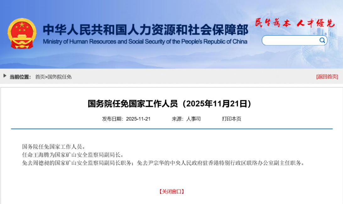 人社部網(wǎng)站11月21日消息:國務(wù)院任免國家工作人員。任命王海騰為國家礦山安全監(jiān)察局副局長。