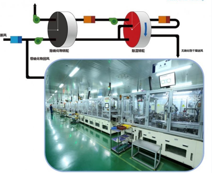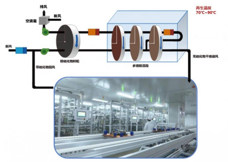 生產(chǎn)車間中濃度較低的H?S 氣體,會(huì)被除濕系統(tǒng)的負(fù)壓回風(fēng)帶入除濕機(jī)內(nèi)部。該除濕機(jī)裝有活性炭過(guò)濾器/除硫轉(zhuǎn)輪,可先吸附硫化氫,再進(jìn)行除濕。