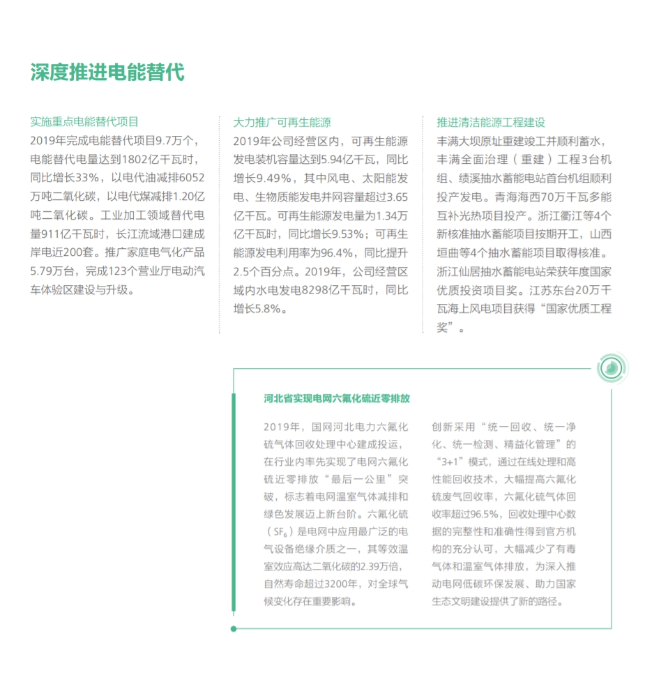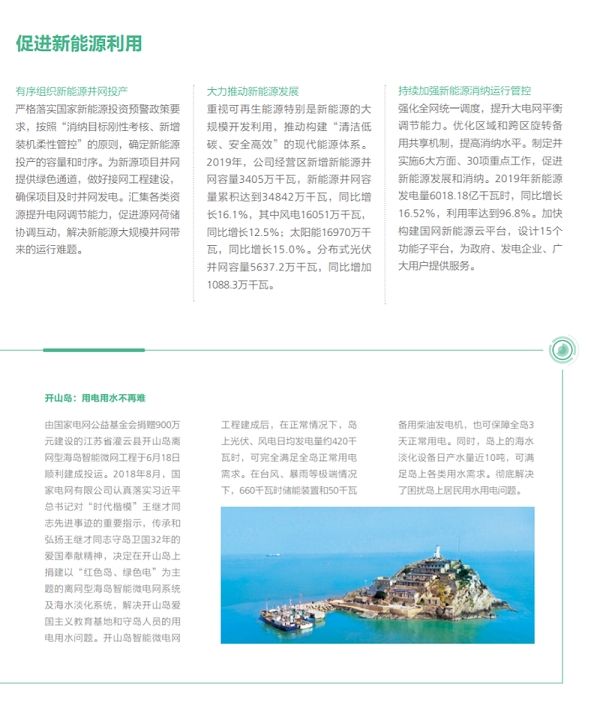 在努力做綠色發(fā)展的表率方面,國家電網(wǎng)有限公司認真貫徹落實綠色發(fā)展理念,全力推進生態(tài)文明建設(shè),推動能源更高質(zhì)量、更可持續(xù)發(fā)展,以綠色低碳高效的充足電能,全力服務(wù)美麗中國建設(shè)。2019年經(jīng)營區(qū)新增新能源并網(wǎng)容量3405萬千瓦,新能源并網(wǎng)容量累積達到34842萬千瓦,同比增長16.1%,新能源云平臺接入新能源場站55萬余座、裝機容量2.3億千瓦,累計交易額754.3億元,帶動產(chǎn)業(yè)鏈上下游3000余家企業(yè)協(xié)同發(fā)展;完成電能替代項目9.7萬個,電能替代電量達到1802億千萬時,“煤改電”配套電網(wǎng)建設(shè)惠及19684個村、372萬戶居民,以電代油減排二氧化碳6052萬噸,以電代煤減排二氧化碳1.20億噸;智慧車聯(lián)網(wǎng)平臺累計接入充電樁43萬個,充電量達14.82 億千瓦時,同比增長73.86%。