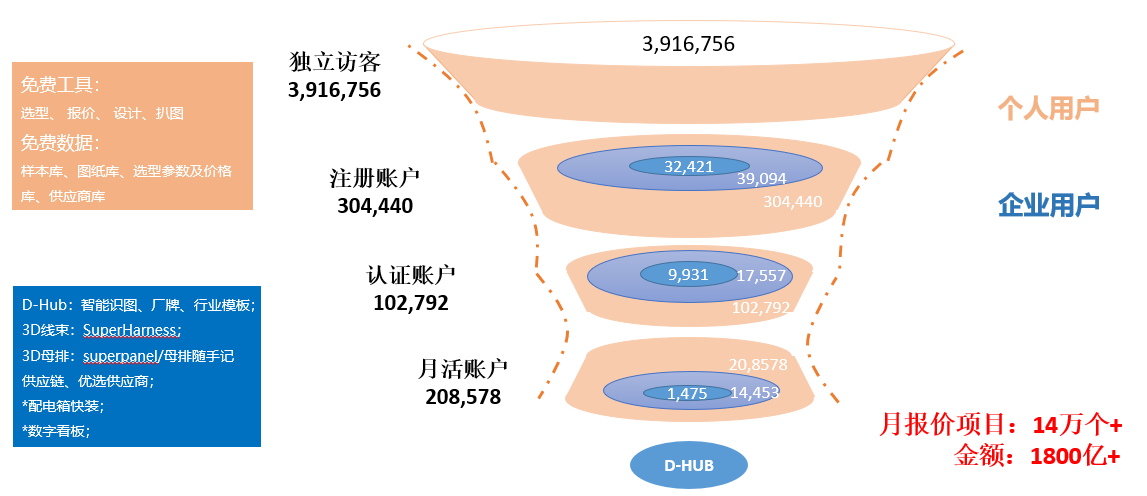 我們既然定下這個目標(biāo),就要一步一步來實施,做云端SaaS服務(wù),把原來的賣軟件的業(yè)務(wù)變成云服務(wù)。把我們原來的報價軟件、設(shè)計軟件全部云端化并且共享一個數(shù)據(jù)庫。我們又做了選型軟件、生產(chǎn)安裝的軟件,目前正在開發(fā)數(shù)字看板和數(shù)字工廠,所有的這些產(chǎn)品通過D-Hub是共享同一套數(shù)據(jù)庫。我們把原來離線的產(chǎn)品都變成在線,其中一部分軟件和數(shù)據(jù)免費為用戶服務(wù),這些免費的軟件和內(nèi)容吸引了大量的用戶,現(xiàn)在我們的獨立訪客有390萬。當(dāng)然我們也有收費的產(chǎn)品D-Hub。利馳已經(jīng)從一家CAD軟件公司轉(zhuǎn)變?yōu)樵诰€服務(wù)公司,我們其中的一個在線服務(wù)——電氣工程項目報價——最新的數(shù)據(jù)顯示一個月可以報14萬個項目,總價值約1800億。