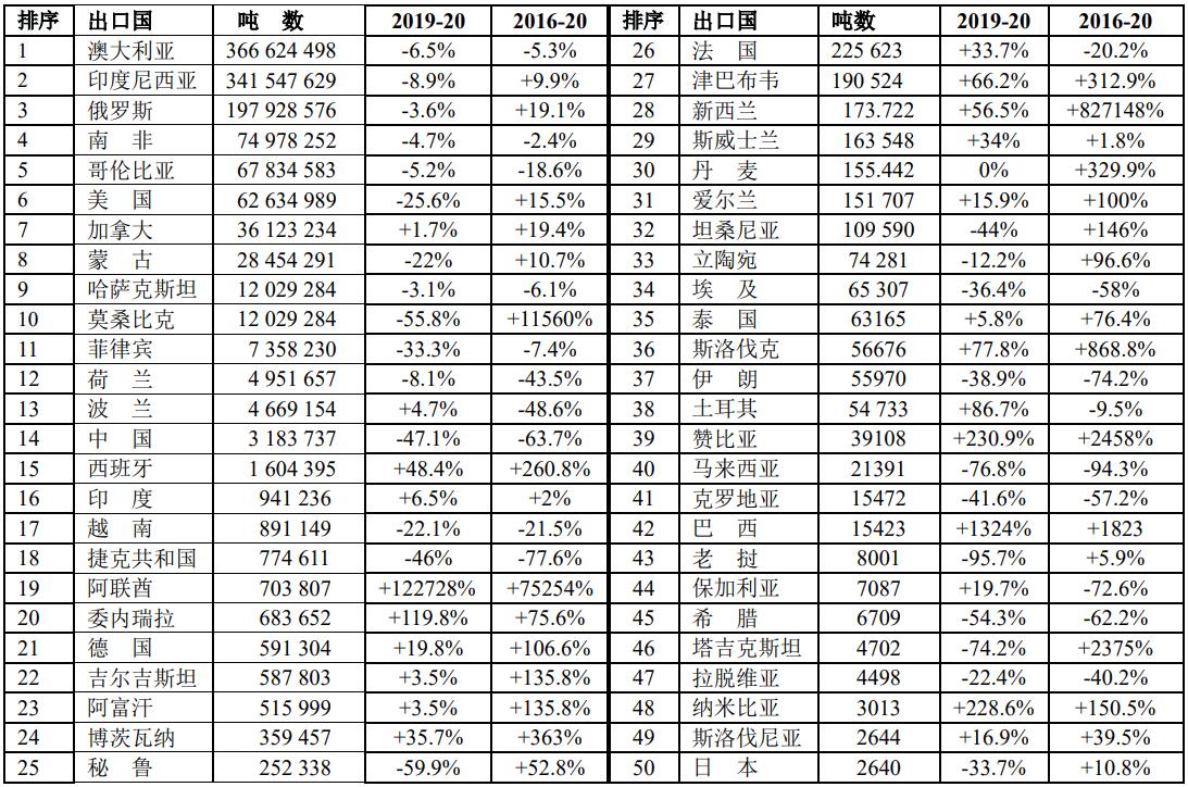 2020年煤進(jìn)口前15位國家和地區(qū)的數(shù)量
