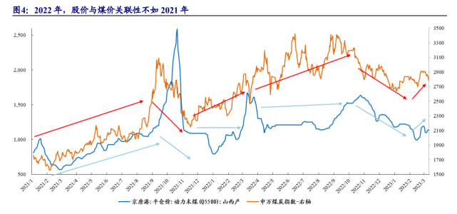 2022年,煤炭行業(yè)周期屬性弱化。2022年2月底,國家發(fā)改委發(fā)布《關(guān)于進(jìn)一步完善煤炭市場(chǎng)價(jià)格形成機(jī)制的通知》,明確了電煤中長期合同價(jià)格合理區(qū)間,確立了電煤中長期合同價(jià)格形成機(jī)制,通知自2022年5月1日起執(zhí)行。2022年7月,國家發(fā)改委進(jìn)一步要求電煤中長期合同嚴(yán)格落實(shí)三個(gè)100%(簽約率、履約率、價(jià)格政策執(zhí)行),同時(shí),對(duì)電煤現(xiàn)貨交易價(jià)格設(shè)置價(jià)格上限。2022年,電煤長協(xié)價(jià)格維持在720元/噸附近,電煤港口限價(jià)1155元/噸。2022年,在限價(jià)政策下,能源需求仍具韌性,俄烏沖突加速全球能源供需錯(cuò)配,煤價(jià)高位震蕩。隨著電煤中長期合同的簽約執(zhí)行,長協(xié)簽約率不斷提升,現(xiàn)貨煤價(jià)波動(dòng)性明顯減弱,股價(jià)與煤價(jià)關(guān)聯(lián)性亦減弱。從2022年股價(jià)與煤價(jià)走勢(shì)圖看,2021年12月-2022年3月,煤價(jià)走勢(shì)呈現(xiàn)“V”字型,而股價(jià)波動(dòng)上漲,2022年4-9月,煤價(jià)平緩波動(dòng),股價(jià)波動(dòng)上行并創(chuàng)年內(nèi)新高,2022年股價(jià)與煤價(jià)關(guān)聯(lián)性明顯不如2021年。電煤長協(xié)價(jià)格的相對(duì)穩(wěn)定以及長協(xié)簽約率的提升,必將導(dǎo)致煤企盈利趨于穩(wěn)定,煤炭行業(yè)周期屬性趨于弱化。