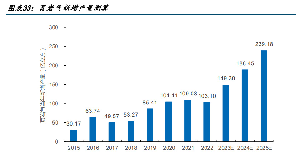 對于頁巖氣產(chǎn)量的遠期預(yù)測,我們結(jié)合《頁巖氣發(fā)展規(guī)劃 2016-2020》展望的 2030 年實 現(xiàn)頁巖氣產(chǎn)量 800 至 1000 億立方,與中國頁巖氣當前勘探開發(fā)、技術(shù)進步、設(shè)備總體形 式預(yù)測,預(yù)計 25 年頁巖氣產(chǎn)量有望占到天然氣產(chǎn)量的 15%,即頁巖氣產(chǎn)量在 25 年達到 460 億方,22 至 25 年 CAGR22.62%。