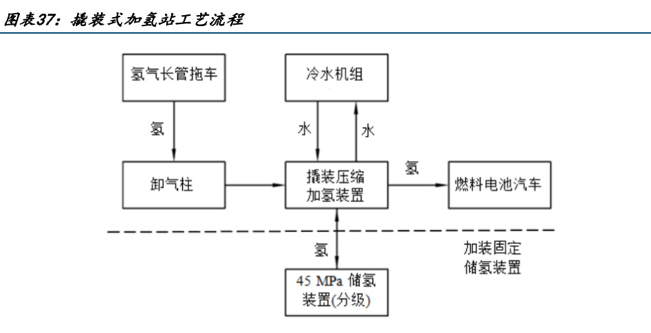 2)固定式加氫子站:壓縮機與加氫機分開設(shè)置,進一步提升安全性 。固定式加氫子站工藝流程與含固定儲氫裝置的撬裝加氫站類似,20 MPa 高壓氫氣由長管 拖車自氣源點運送至加氫站,通過卸車軟管和卸氣柱使長管拖車與站內(nèi)工藝管路對接,壓 縮機開啟后從長管拖車抽氣增壓至 45 MPa,并儲存在固定儲氫裝置內(nèi)。當車輛進站加注 時,加氫機從站內(nèi)固定儲氫裝置分級取氣進行加注。