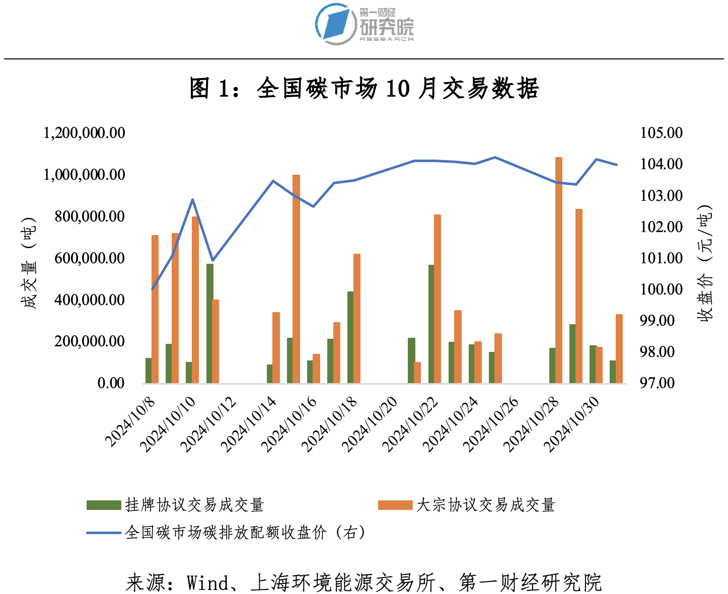 10月全國碳市場碳排放配額(CEA)總成交量1324.58萬噸,總成交額12.96億元。掛牌協(xié)議交易月成交量410.08萬噸,月成交額4.20億元。大宗協(xié)議交易月成交量914.49萬噸,月成交額8.75億元。10月CEA最高價104.60元/噸,最低價99.73元/噸,10月最后一個交易日收盤價較9月最后一個交易日上漲4.55%。截至10月31日,CEA累計成交量4.94億噸,累計成交額297.17億元。