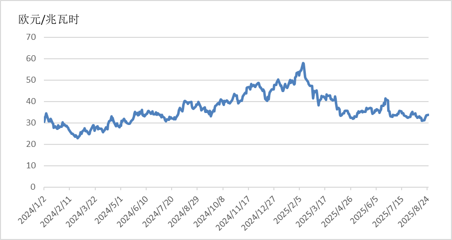 截至8月25日,TTF天然氣期貨主力合約收于33.774歐元/兆瓦時(shí),月環(huán)比上漲3.92%,相較2024年同期的37.655歐元/兆瓦時(shí),下降10.31%。
