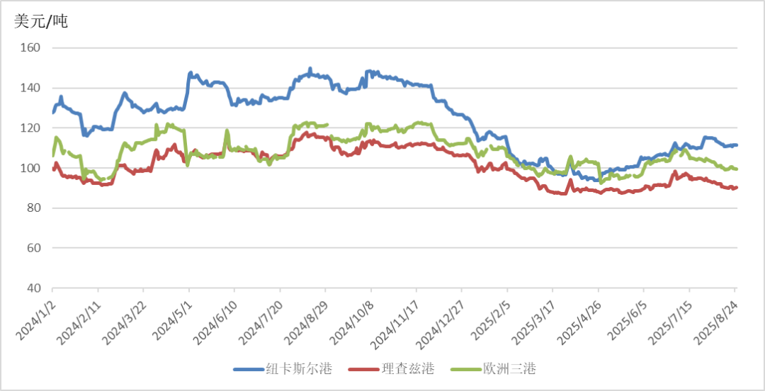 截至8月25日,澳大利亞紐卡斯?fàn)柛勖禾科谪泝r(jià)格報(bào)收于111.3美元/噸,月環(huán)比上漲1.00%,相較2024年同期的145.7美元/噸,下降23.61%;南非理查茲港煤炭期貨價(jià)格報(bào)收于90.2美元/噸,月環(huán)比下降4.85%,相較2024年同期的115.4美元/噸,下降21.84%;歐洲三港煤炭期貨價(jià)格報(bào)收于99.5美元/噸,月環(huán)比下降4.70%,相較2024年同期的121.15美元/噸,下降17.87%。